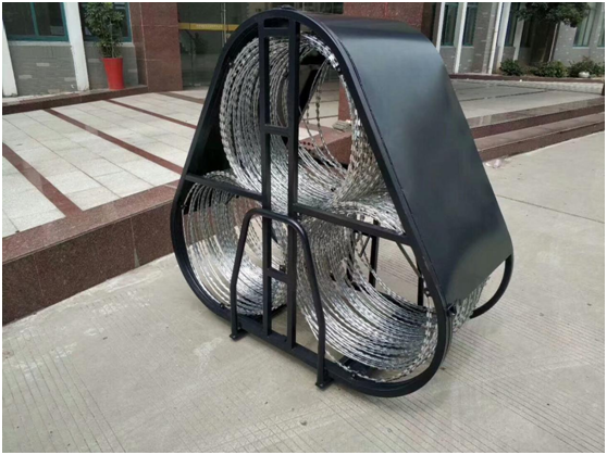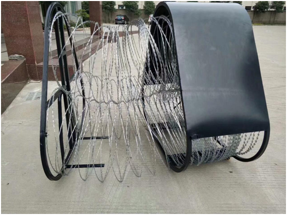2、阻隔網(wǎng)為三組金屬刀片的伸縮網(wǎng)相互用金屬扣聯(lián)接成品形結構,伸縮網(wǎng)外露,阻隔高度約為兩組伸縮網(wǎng)的直徑之和,防翻轉和破壞的能力強,不借助于器械的情況下不易攀爬、翻越和破壞。
